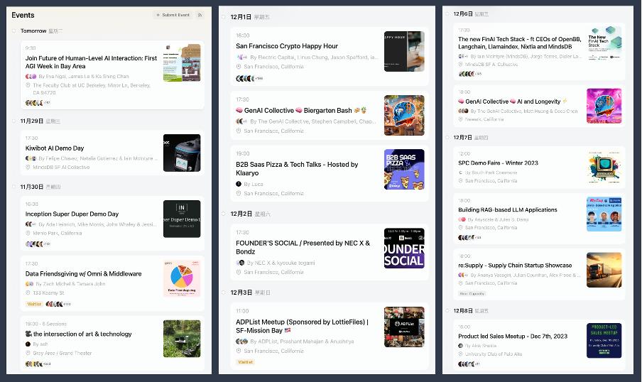 这个区域的氛围就像当年华清嘉园周边、中关村创业大街一样,大量咖啡馆、开放空间,基本上每天都有沙龙、聚会、路演,和各种Happy Hour,大家讨论机器学习技术,讨论大模型应用,讨论未来的各种可能。活动之多,甚至专门有创业者做汇聚这些活动的网站,都获得了很大的流量。