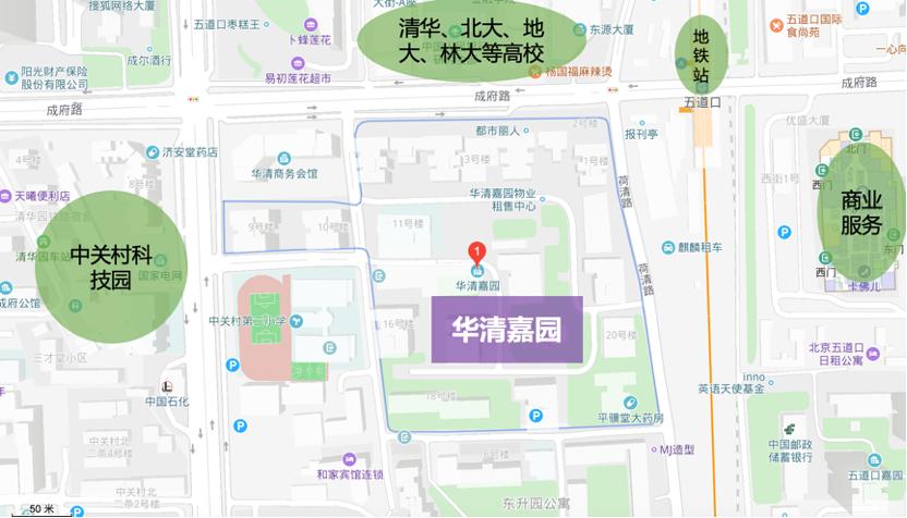 说它是资源高地,是因为这个小区在五道口,离清华、北大和中科大非常近,人才资源、技术资源密集,周边的公共服务设施非常充裕,而且交通便利,距离地铁13号线五道口站也就几步路。