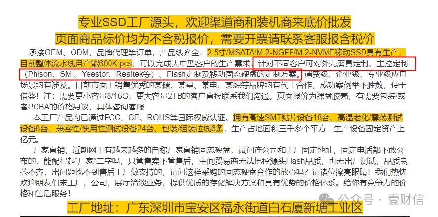 同时,1688网站中还介绍了威刚实业的产品及相关业务。在产品分类导航中可以看到该企业存在OEM业务,点击进入OEM产品详情页面中可以看到介绍称,威刚实业承接OEM、ODM、品牌代理等订单,产品线齐全,可以完成大中型客户的生产需求,针对不同客户可对外壳磨具定制、主控定制(Phison、SMI、Yeestor、Realtek等)、Flash定制及移动固态硬盘的定制方案。在品牌代工的业务的指控定制中赫然出现了Yeestor品牌名称,这个品牌则是得一微的主打品牌。