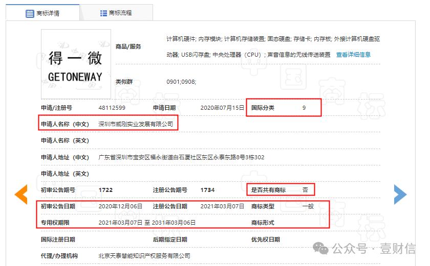 国家知识产权局商标查询系统显示,威刚实业有两个“得一微”及英文组合成的商标,申请时间分别为2020年7月15日、2022年1月21日,且均已注册成功。
