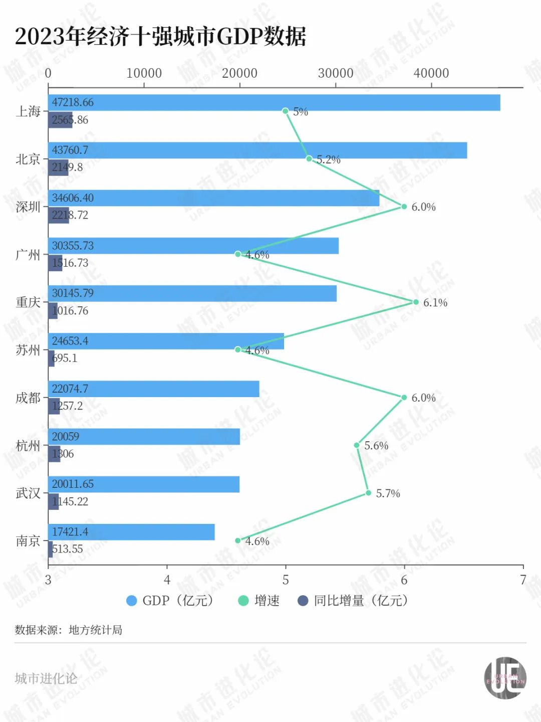 2023年,上海、北京GDP分别达到47218.66亿元、43760.7亿元,跨过4万亿元台阶之后,继续向上突破城市“天花板”。而深圳猛增2千亿元,GDP达到34606.4亿元,稳坐“第三极”。