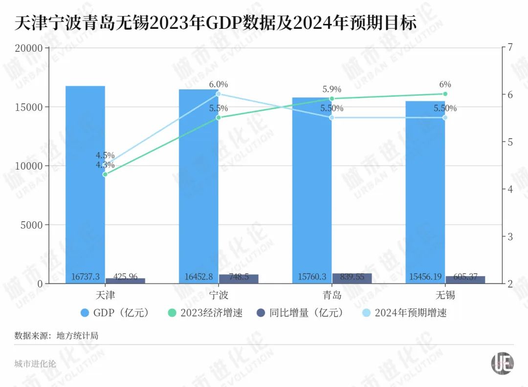 2023年,南京、天津、宁波和青岛GDP增速分别为4.7%、4.3%、5.5%、5.9%,南京、天津跑输全国大盘;2024年,四市预期GDP增速分别为5.0%、4.5%、6.0%、5.5%,宁波、青岛有望继续保持追赶态势。