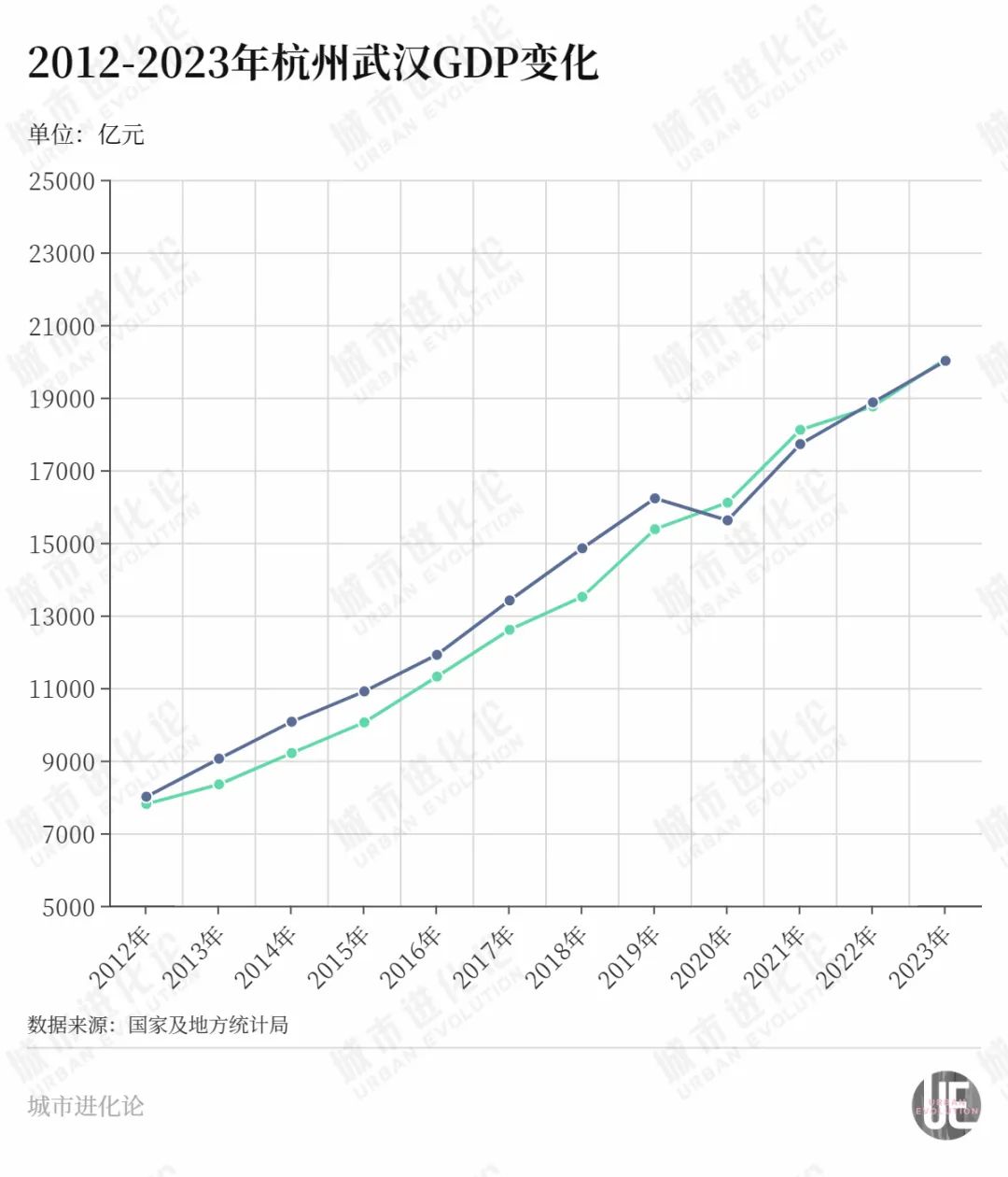 拉长时间先来看,2012年武汉经济总量超过杭州,直到2020年因受疫情冲击被后者超越,此后在2022年才重新夺回“第八城”的位置,而眼下杭州已经又一次逆转武汉。