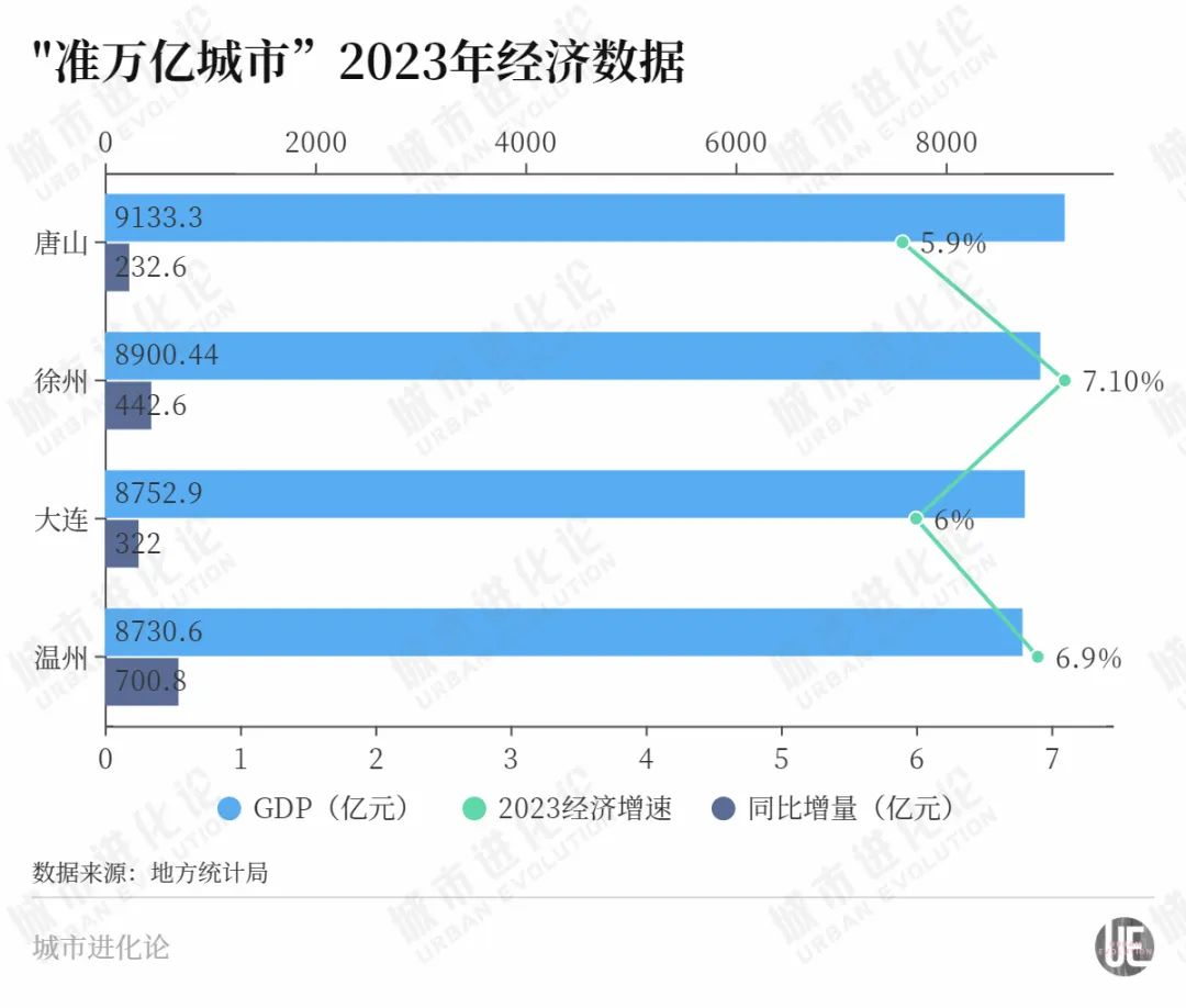 排在两座新晋万亿城市之后,2023年唐山、徐州、大连、温州GDP分别达到9133.3亿元、8900.44亿元、8752.9亿元、8730.6亿元,均具备在未来三年内冲击“万亿俱乐部”的实力。
