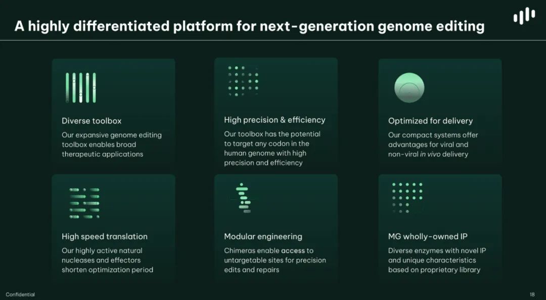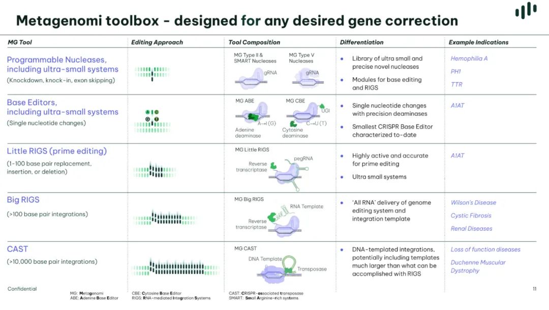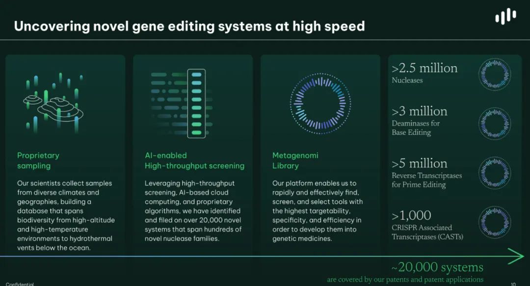 Metagenomi拥有一系列全资拥有的下一代基因编辑系统,通过应用机器学习挖掘微生物基因组,从中寻找能够用于基因编辑的新的核酸酶。