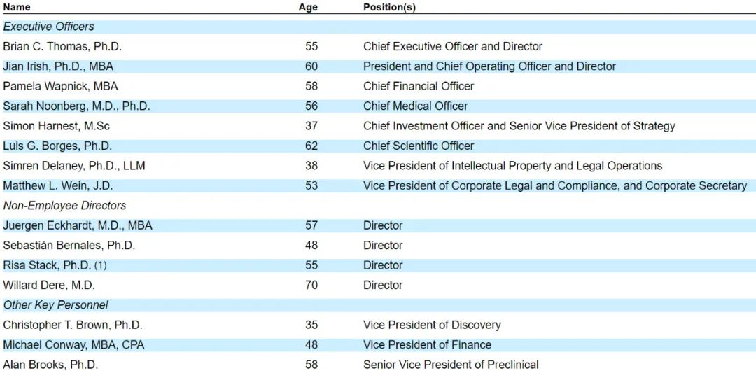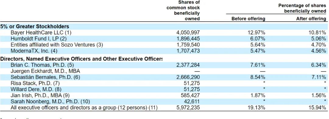 IPO前,Bayer HealthCare LLC(拜耳医药)持股为12.97%,Humboldt Fund I, LP持股为6.07%,Sozo Ventures持股为5.64%,ModernaTX持股为5.47%,Brian C. Thomas, Ph.D.持股为7.61%,Sebastián Bernales, Ph.D. 持股为8.54%,Jian Irish, Ph.D., MBA持股为1.87%。