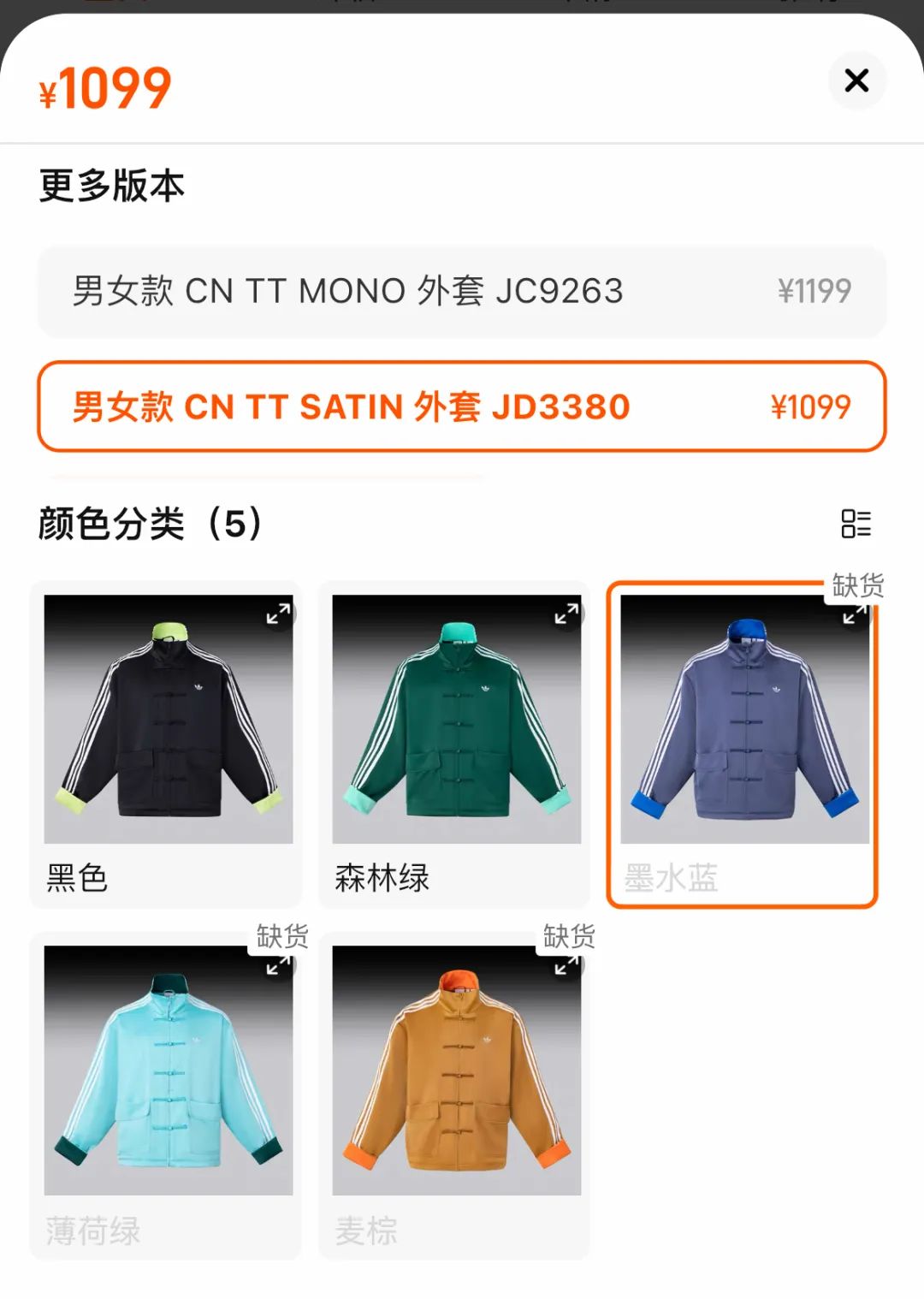 举例来说,三叶草的新中式在1月15日正式发售,三个颜色,分别是墨水蓝、薄荷绿、麦棕,官方售价1099元/件,目前天猫旗舰店墨水蓝已经售罄,并且仅限于店铺会员购买。