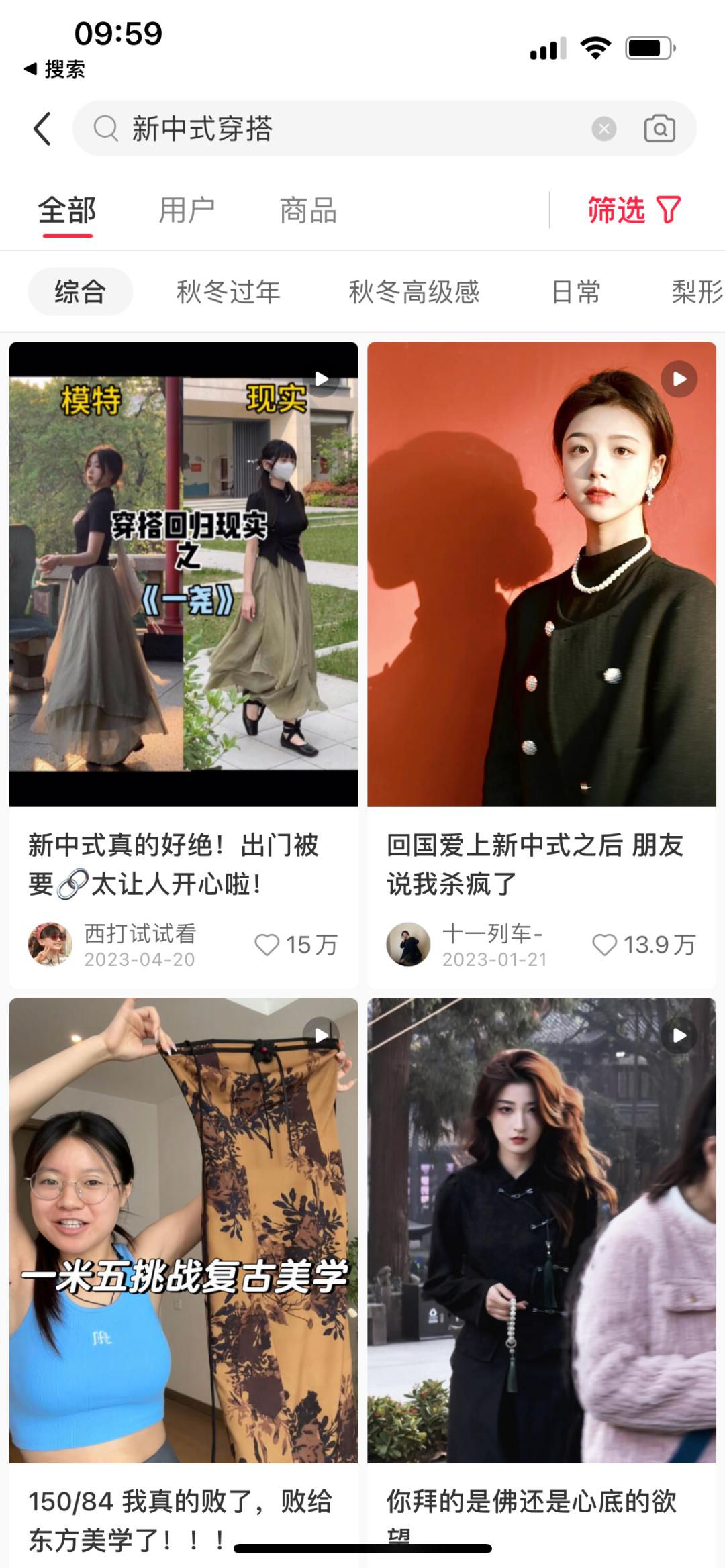 在社交网络上,「新中式穿搭」也成为热议话题。在小红书平台,#新中式 词条有26.5亿浏览;具体到「新中式穿搭」,热度最高的一篇笔记有15万点赞。