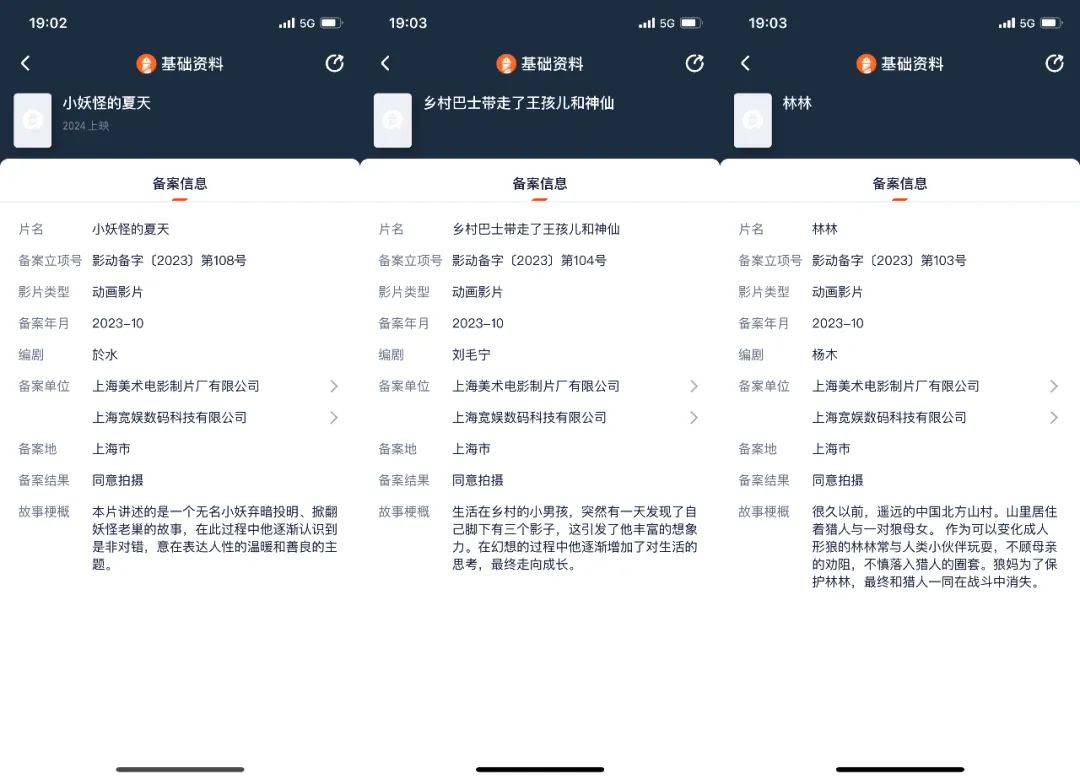 2023年Q4,上海美术电影制片厂(上美影)、上海宽娱数码科技(B站)共同备案了3部作品,分别是《林林》《乡村巴士带走了王孩儿和神仙》《小妖怪的夏天》。据悉,这三部影片均改编自上美影与B站联合出品的国产动画短片合集《中国奇谭》中的一集。