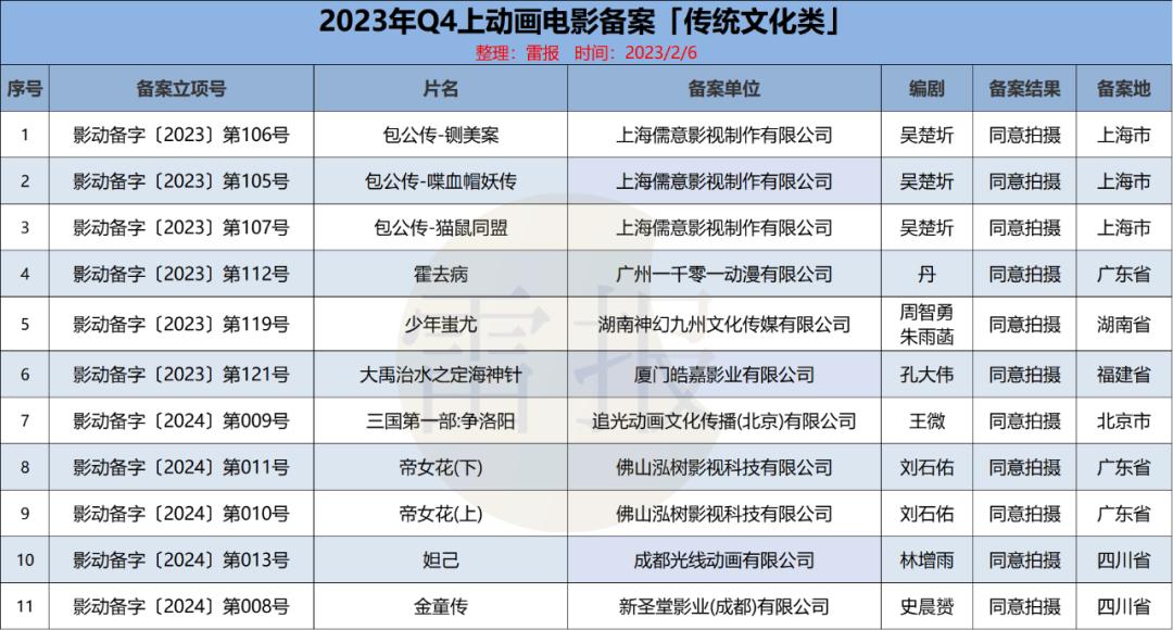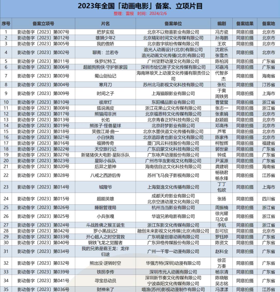 雷报也曾在2023年年内报道过 Q1-Q2 以及 Q3 的动画电影备案立项情况。1月30日,国家电影局发布了“关于2023年12月下全国电影剧本(梗概)备案、立项公示的通知”。至此,2023年电影备案立项片目已全部公布。