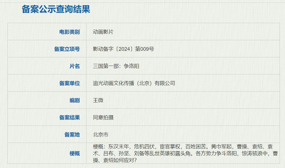 Q4新备案片目《三国第一部:争洛阳》也属于新文化系列,是一部历史向题材的作品。有《长安三万里》珠玉在前,这部作品也十分值得关注。故事梗概如下:东汉末年,危机四伏,宦官掌权,百姓困苦。黄巾军起,曹操、袁绍、袁术、吕布、孙坚、刘备等乱世英雄初露头角。各方势力争斗洛阳,惊涛骇浪中,曹操、袁绍如何应对?