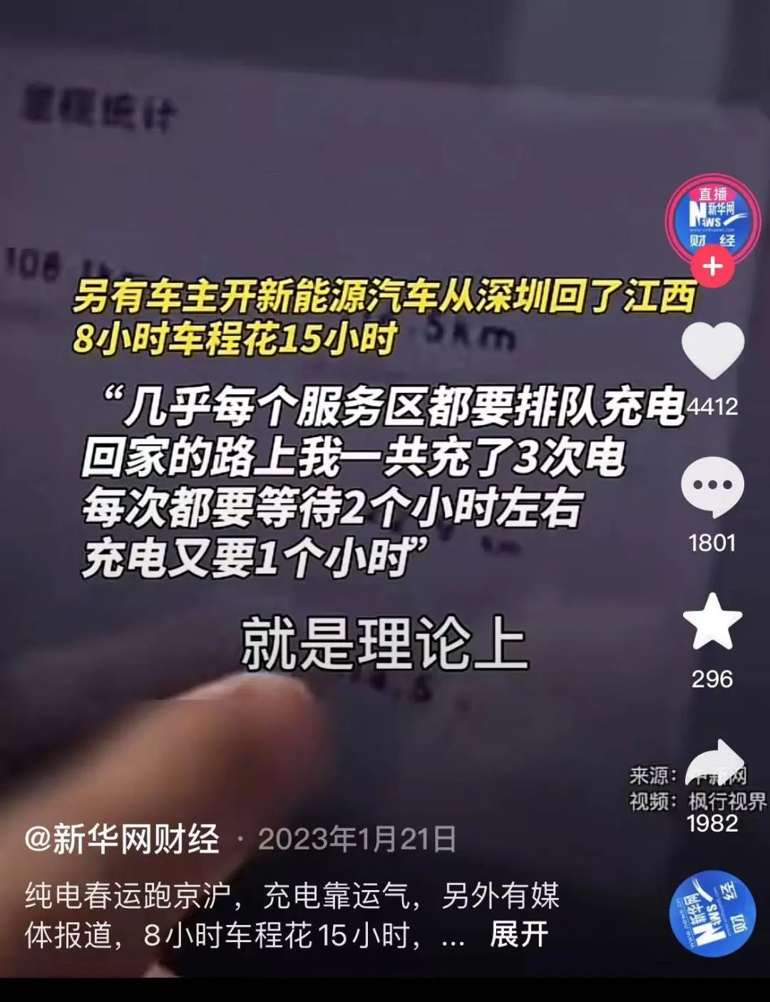另有车主开新能源车从深圳回江西,8小时车程花了15小时,几乎每个服务区都要排队充电,回家的路上充了3次电,每次都要等待2个小时,充电1个小时。