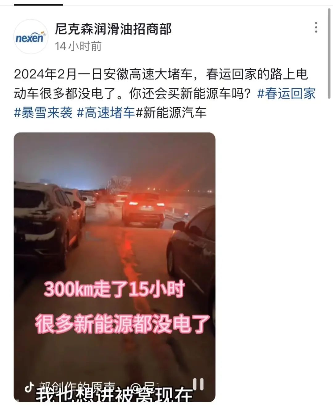 也有车主在安徽高速大堵车,发现路上电动车很多都没电了,300公里走了15个小时,也表示后悔了。