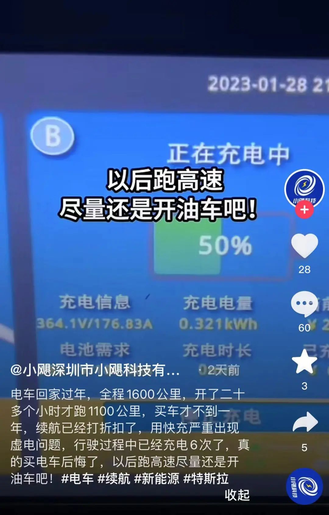 因此,在当下,又有不少新能源车主后悔上高速的声音出现了。有车主表示,电车回家过年,全程1600公里,开了二十多个小时才跑1100公里,一年续航已经打折,行驶过程充电6次,真的买电车后悔了,以后跑高速尽量开油车吧。