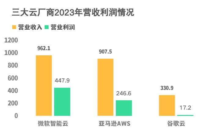 微软智能云包括Azure、Windows Server、SQL Server、Visual Studio、GitHub和企业服务等板块,2023年微软智能云总营收达到了962.1亿美元,同比增长17.6%。谷歌云总营收为330.9亿美元,同比增长25.9%;亚马逊AWS总营收为907.5亿美元,同比增长13.4%。