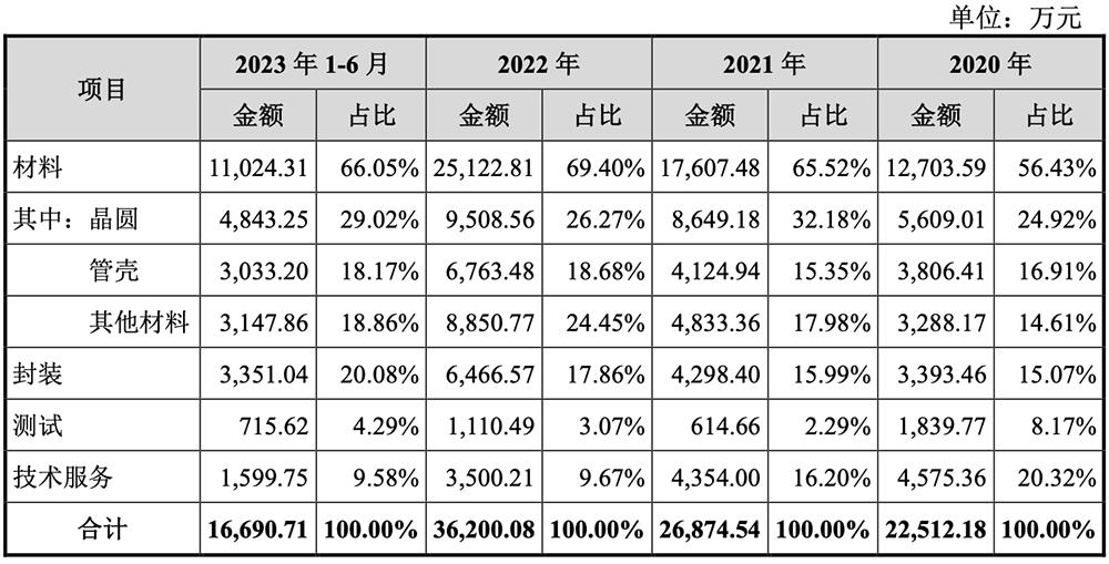 2020年至2022年材料采购占比提升,主要是根据公司生产需求及研发项目进展加大了晶圆等原材料的储备。测试采购占比降低,主要原因是随着公司自身检测能力的增强,该公司逐步降低了外协检测的采购比例。