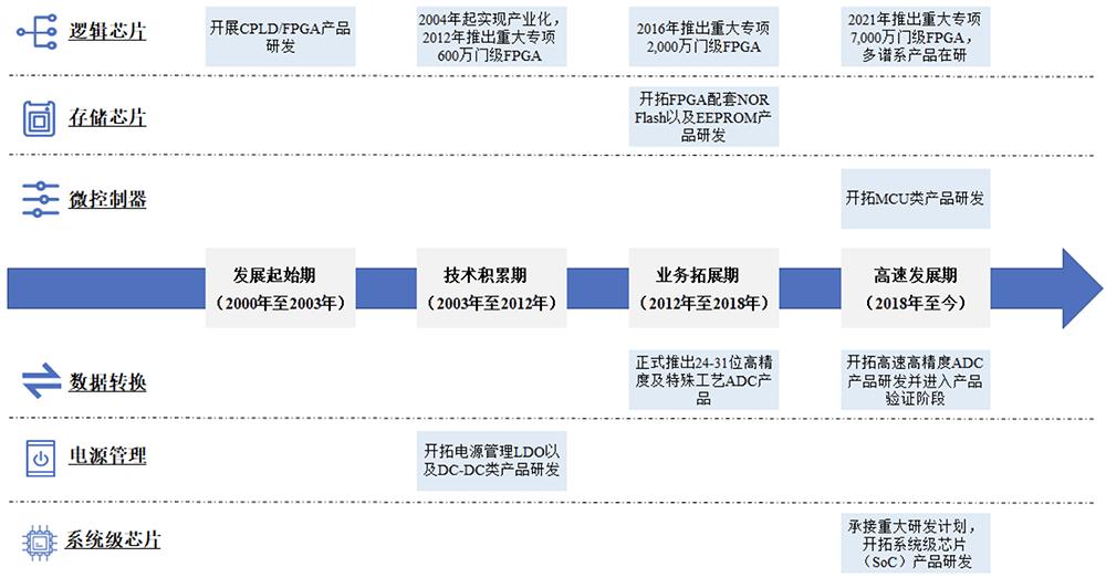 其产品广泛应用于电子、通信、控制、测量等特种领域,主要包括以可编程逻辑器件(CPLD/FPGA)为代表的逻辑芯片、存储芯片及微控制器等数字集成电路产品,以及包括数据转换(ADC/DAC)、总线接口及电源管理等的模拟集成电路产品。