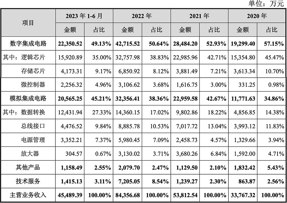 其中数字集成电路产品贡献的收入占比在50%左右,近年呈逐年下降趋势。2023年1-6月,其模拟集成电路产品的收入占比已提高至45%。