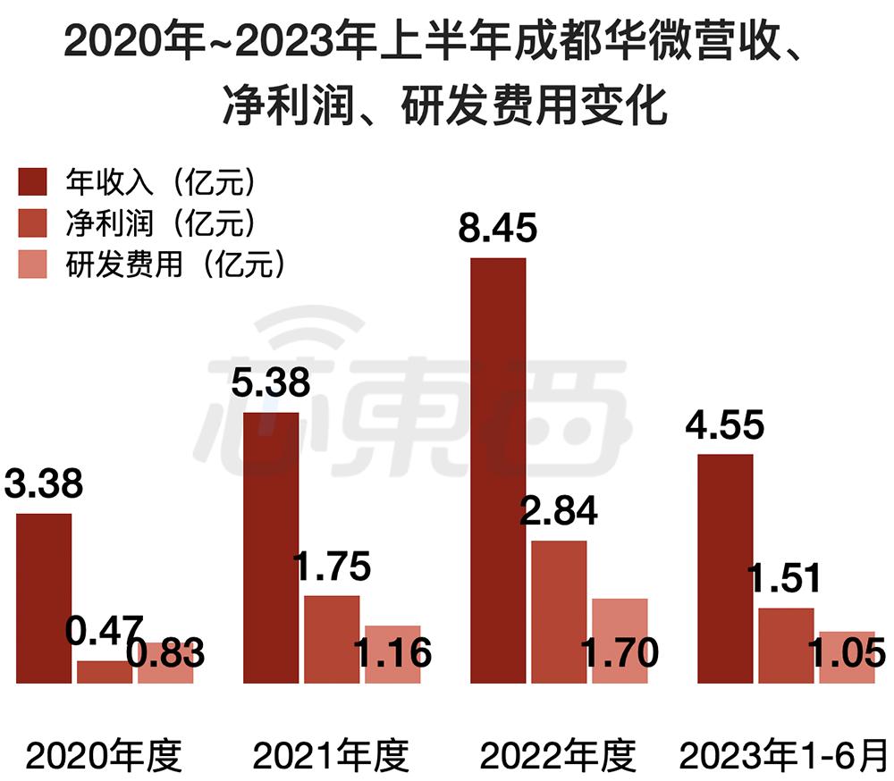 2020年、2021年、2022年、2023年1-6月,成都华微的营收分别为3.38亿元、5.38亿元、8.45亿元、4.55亿元,净利润分别为0.47亿元、1.75亿元、2.84亿元、1.51亿元。