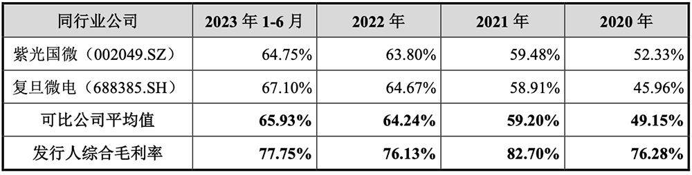 特种领域呈现出高研发投入及高毛利水平的特点。报告期各期,成都华微的综合毛利率分别为76.28%、82.70%、76.13%、77.75%。其与同行业可比公司综合毛利率情况对比如下: