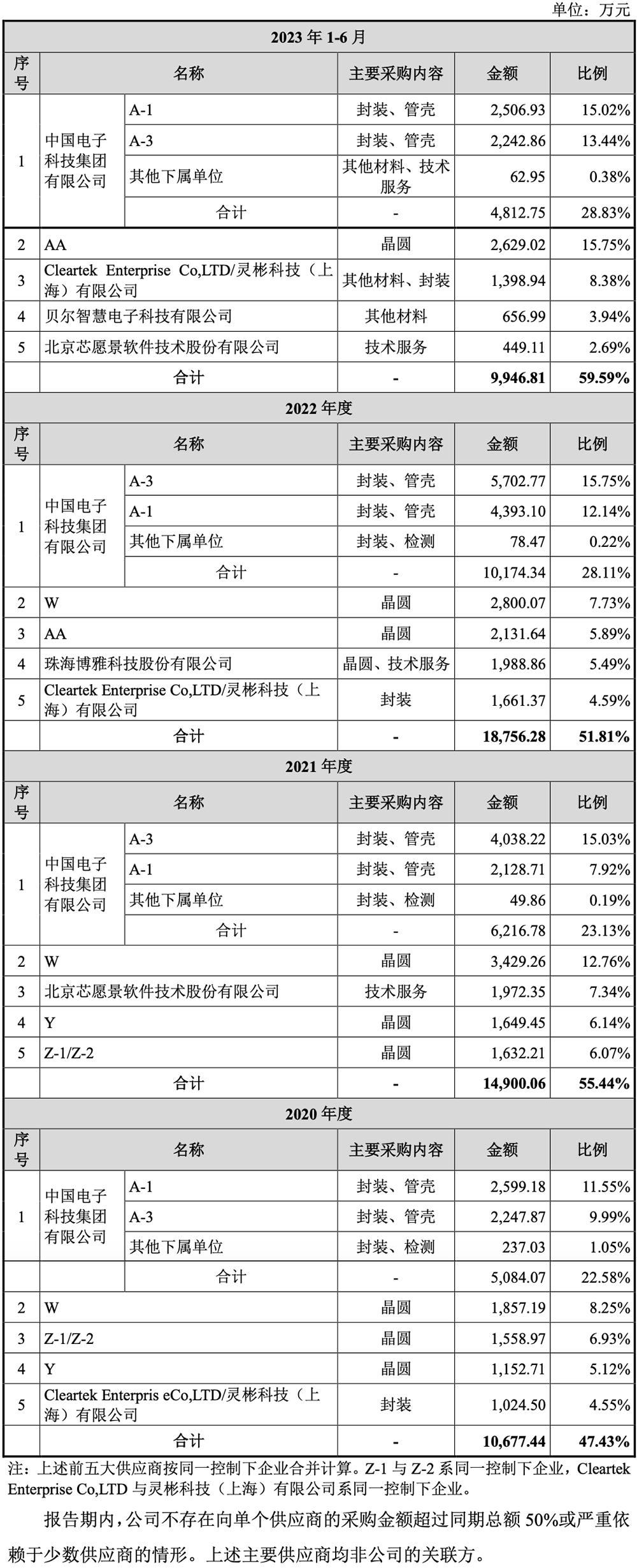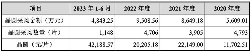 其晶圆采购金额在报告期内分别为5609.01万元、8649.18万元、9508.56万元、4843.25万元,采购单价分别为11702.51元/片、22149.00元/片、20205.18元/片、42188.57元/片,整体呈现上升趋势。