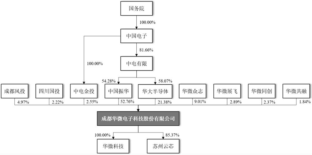 截至招股书签署日,成都华微共有9名股东、2家控股子公司、1家参股公司芯火微测。其中中国振华、华大半导体、成都风投、中电金投、四川国投为国有股东,不存在外资股东。