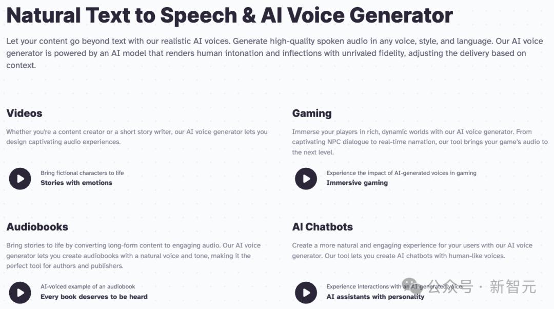 用户只用提供文本,ElevenLabs就能用AI生成非常逼真的语音,不论是视频,游戏,有声读物,AI伴侣,都能用上他们家的产品。