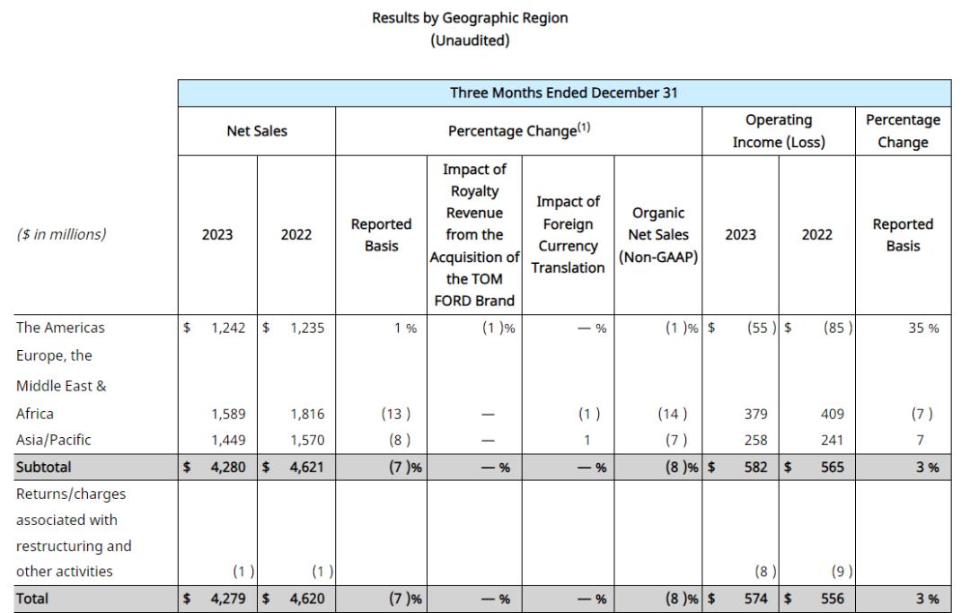 分地区看,报告期内,雅诗兰黛集团在美洲,欧洲、中东和非洲,亚洲/太平洋三大区域的净销售额均呈下滑状态。