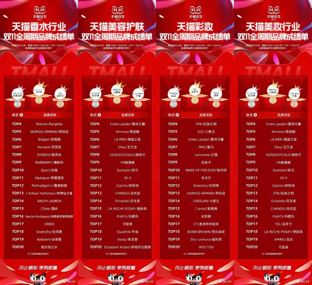 根据天猫美妆公布的榜单数据,在2023年双11购物节期间的美容护肤品类榜单中,集团旗下雅诗兰黛、海蓝之谜两个品牌入榜,分别排名第四、第六位;彩妆品类中,雅诗兰黛、M·A·C、芭比波朗分别位列第六名、第七名和第十八名。相较而言,香水品类表现突出,祖玛珑和Tom Ford揽下TOP2的席位。