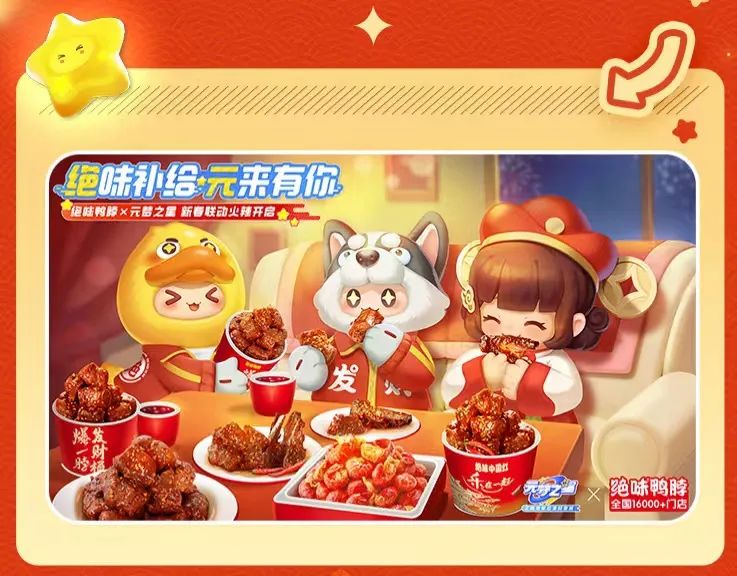 2月2日,《元梦之星》开启了“小年”特别直播,为其春节活动进行了预热;同期#元梦之星承包你的年货#的话题出现在社交平台,串联了游戏与瑞幸咖啡、来伊份、绝味鸭脖、海底捞等各品牌的联名活动,涉及线上线下。