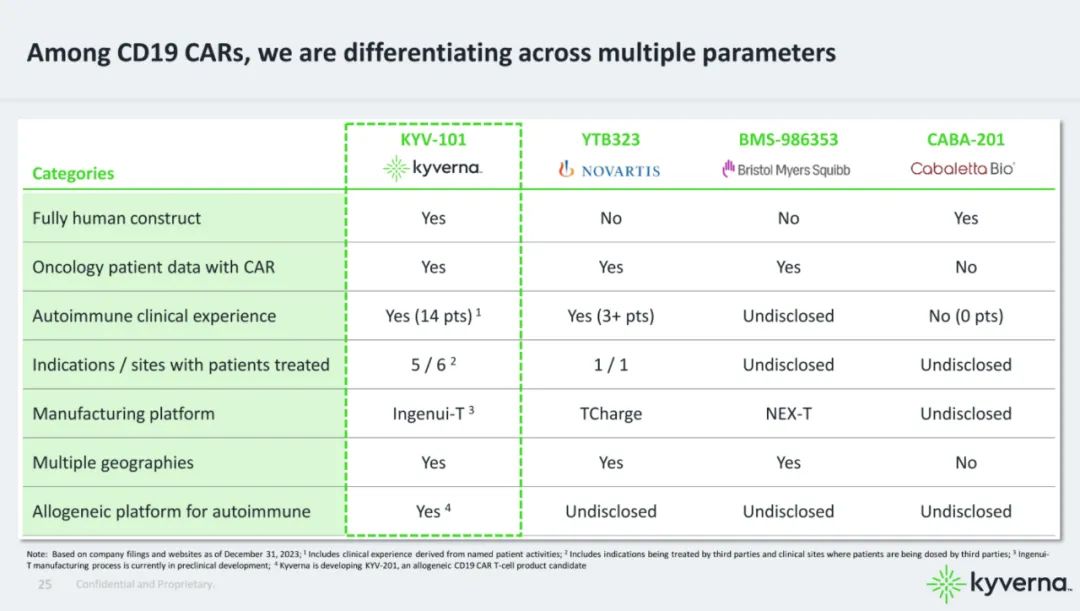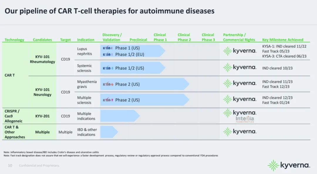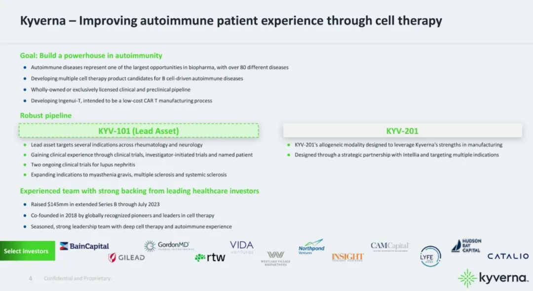 Kyverna宣称是第一批利用CAR-T疗法治疗自身免疫疾病的生物技术公司,其管线组合包括自体和同种异体“下一代”CAR-T疗法,可用于B细胞介导的自身免疫疾病,其中进展最快的管线正处于临床 I/II 期试验中。