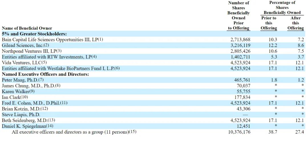 IPO后,Bain Capital Life Sciences Opportunities III, LP持股为7.2%,Gilead Sciences持股为8.6%,Northpond Ventures III, LP持股为7.5%,RTW Investments持股为3.7%;