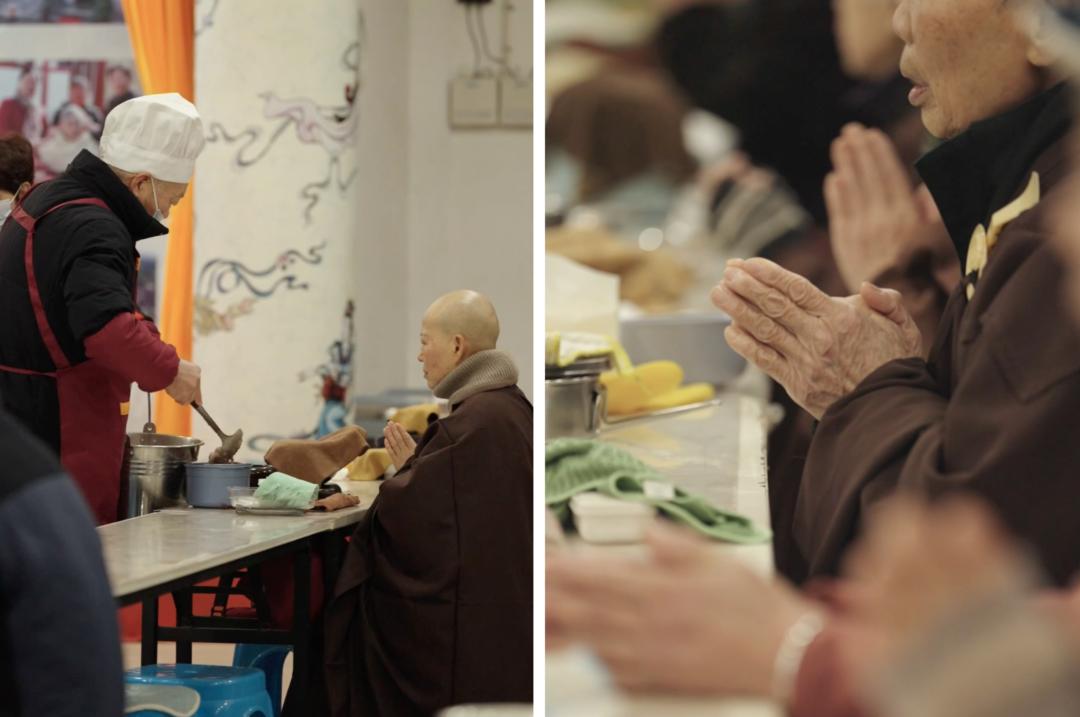 寺院里的作息很规律,早上4:30朝钟,三餐吃素,6:20吃早餐,11点吃中饭,晚上5点吃饭,8点就睡觉了。老人住的楼里也有24小时的念佛堂,老人们随时可以去做功课。