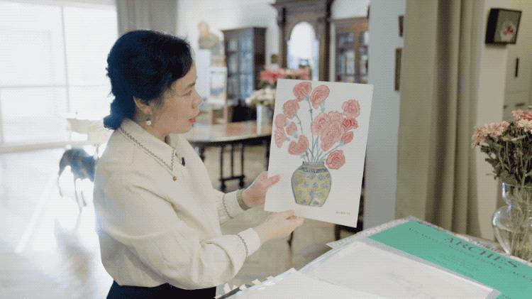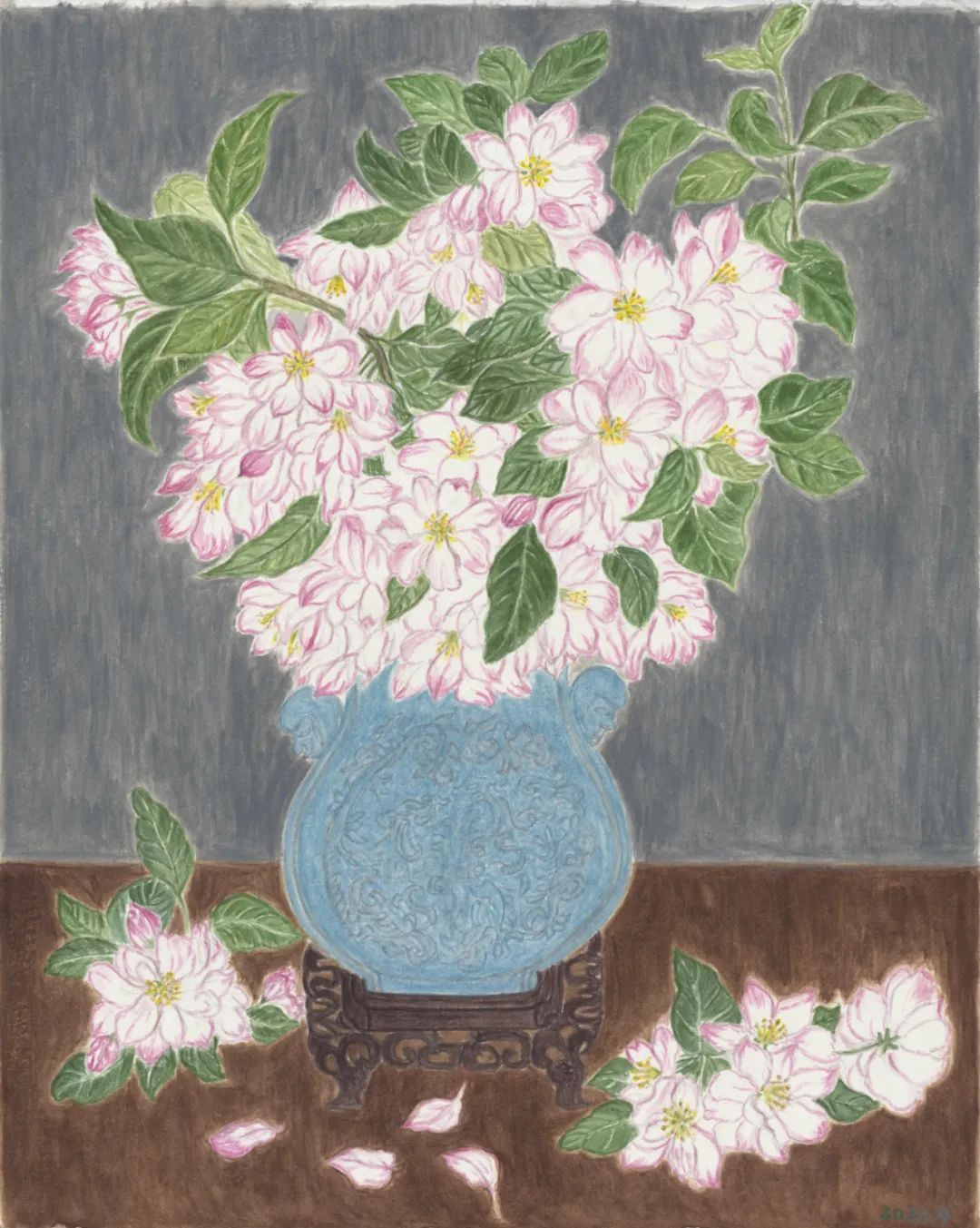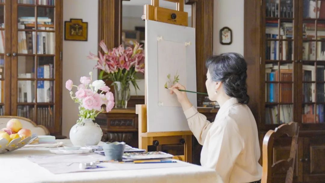 “报答春光”这个名字也是尤勇取的。出自杜甫的《江畔独步寻花七绝句》:报答春光知有处,应须美酒送生涯。“海棠花开的时候,妈妈开始画画的。别的东西只会让她衰老,只有画画,能够开启她的春天。”