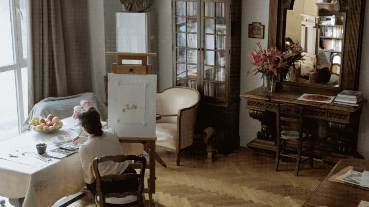 她每天要在画架前坐足7、8个钟头,她画得极慢,近乎一种“绣花”的功夫。用的是水彩,笔细而淡,一点点勾,需要涂上五六次才能接近想象中的颜色。