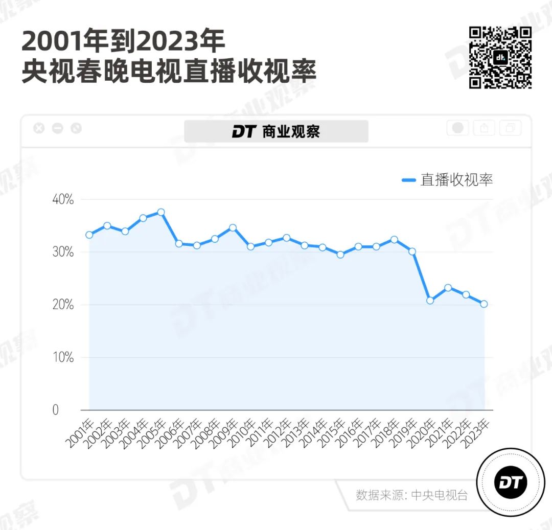 首先,随着视频平台的发展,从2020年开始,春晚的收视率有明显下滑,2020-2023年,都维持在20%左右。