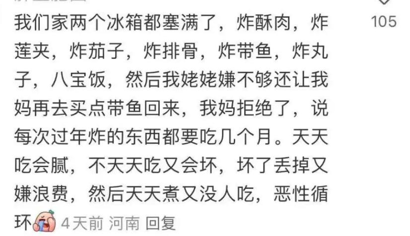 有网友就形容“年货过剩”的心情: 天天吃会腻,不天天吃又会坏,坏了丢掉又嫌浪费,然后天天煮又没人吃,恶性循环。