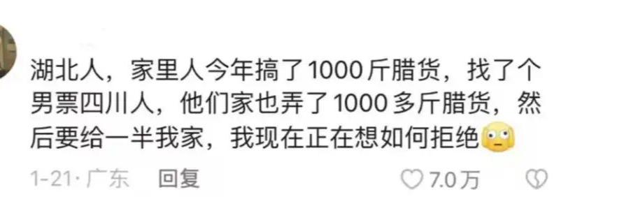 有网友是湖北人,现在最头疼的问题就是家里人今年搞了1000斤腊货,而男票是四川人,家里也弄了1000多斤腊货,要分一半给自己家,现在正想着如何拒绝。