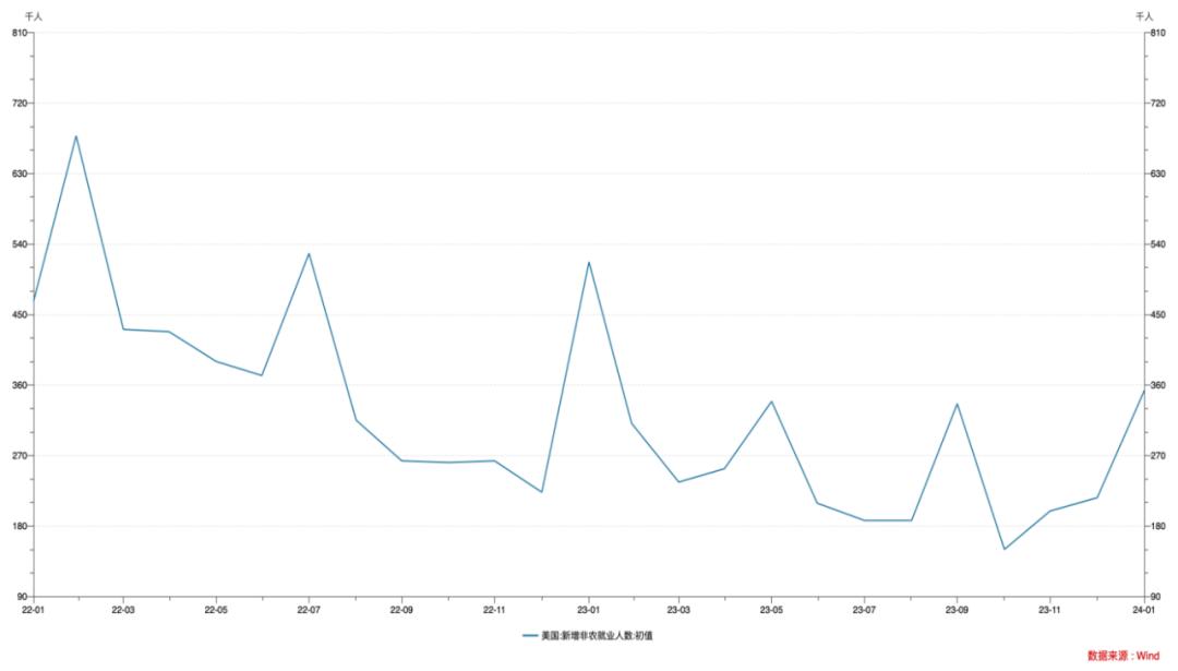 截至目前,美国劳动力市场仍颇具韧性。美国劳工统计局的数据显示,1月,美国新增非农就业人口35.3万,几乎两倍于预期值18.5万。2023年12月前值也被大幅上修为33.3万。非农数据向好,往往意味着美国经济衰退风险较低。