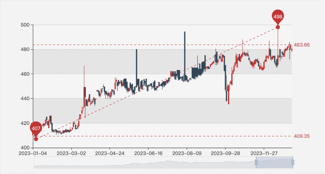 图/2023年初至今上海黄金交易所Au99.99黄金行情(元/克)走势, 来源: 上海黄金交易所