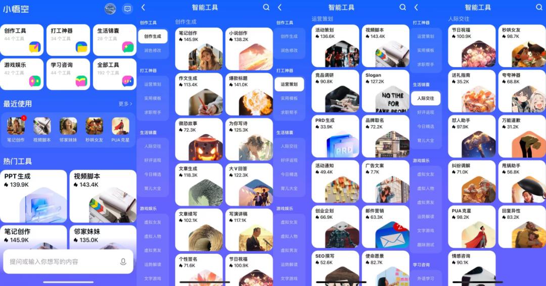 小悟空上的 AI Bot 被称作工具,目前小悟空上共有 192 个公开工具,按照工具的具体功能分成创作工具、打工神器、生活锦囊、休闲娱乐、学习咨询等五种类别。
