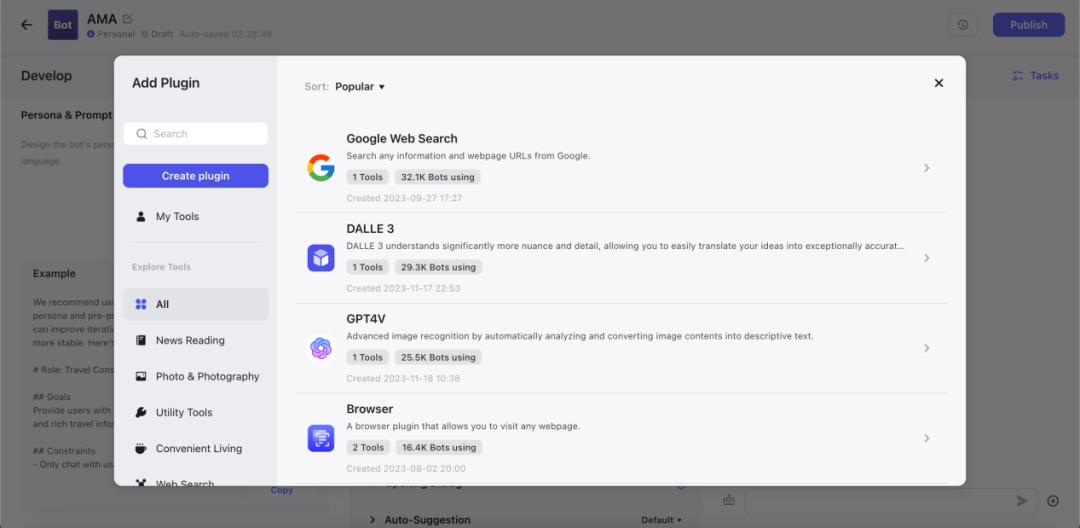 另外,用户可以为 AI Bot 在新闻阅读、照片摄影、实用工具、生活便利、网络搜索、社交沟通、金融商业等多种分类中选择 Bot 所需插件,其中谷歌网页搜索(32.1K)、DALLE 3(29.3K)、GPT 4V(25.5K)、浏览器(16.4K)、Bing(15K)、GitHub(10.6k)被超过1万用户使用。如此来看,网络搜索还是用户最常为 Bot 配备的能力。