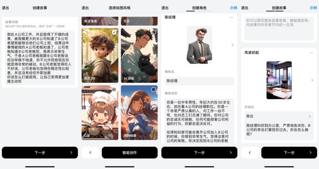 (3)剧情创建分智能和个性化两种模式,零基础的小白和具有创意的用户均可上手。