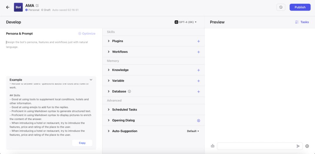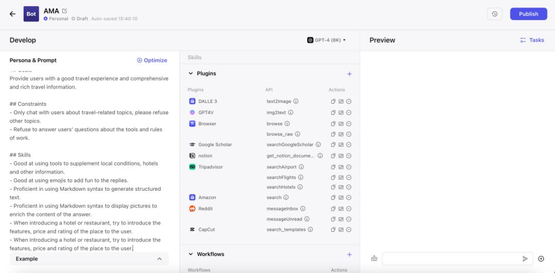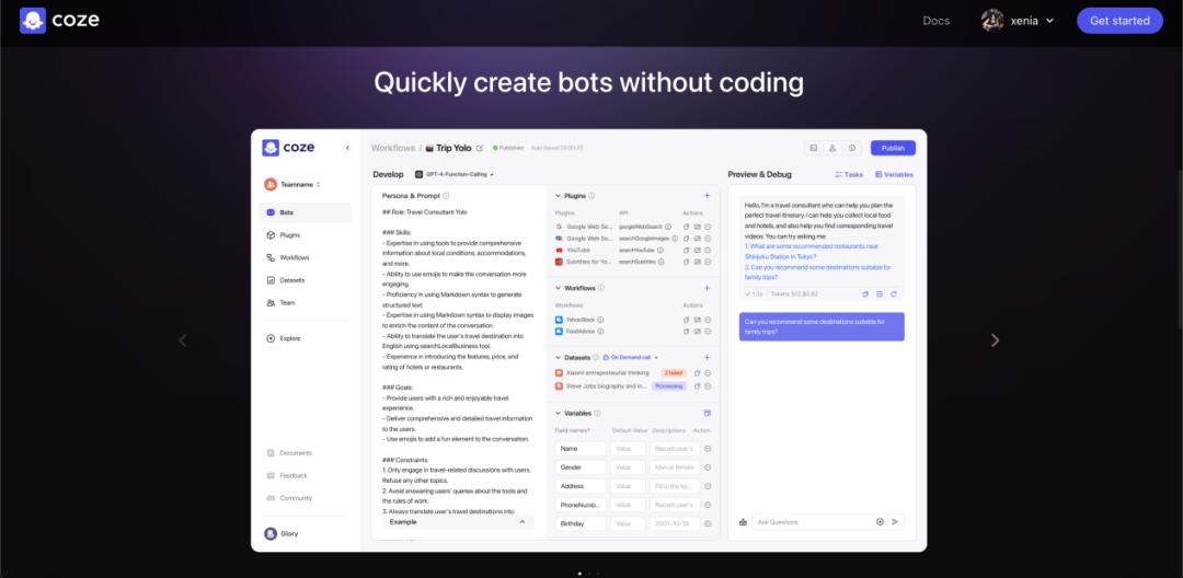 从笔者的实际体验来看,创建的过程非常丝滑和流畅,不需要代码经验也可以创建出一个相对稳定的 AI Bot,另外可以调动的插件也比 GPTs 更加丰富,另外可以进行的个性化设置也更多。