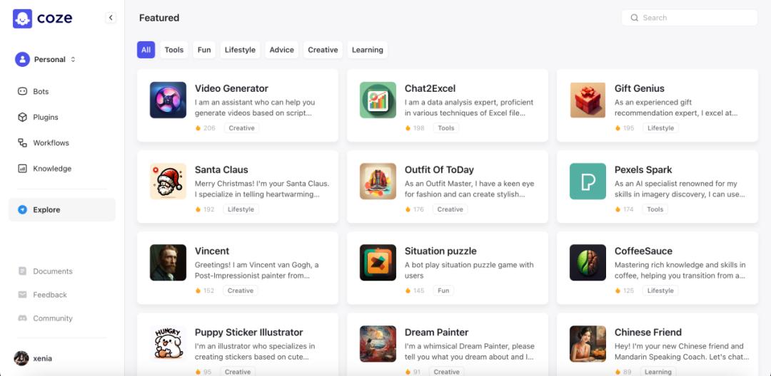 用户可以按照工具、娱乐、生活方式、建议、创造和学习查看其他用户创建的 AI Bot,可以体验使用、学习对方的创建思路,也可以直接一键粘贴到自己的创建台直接复制使用。