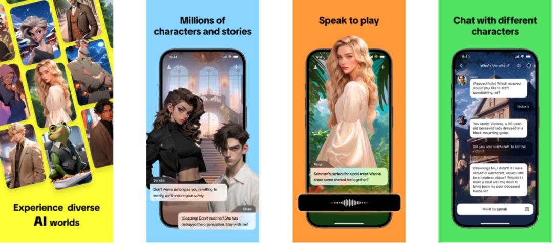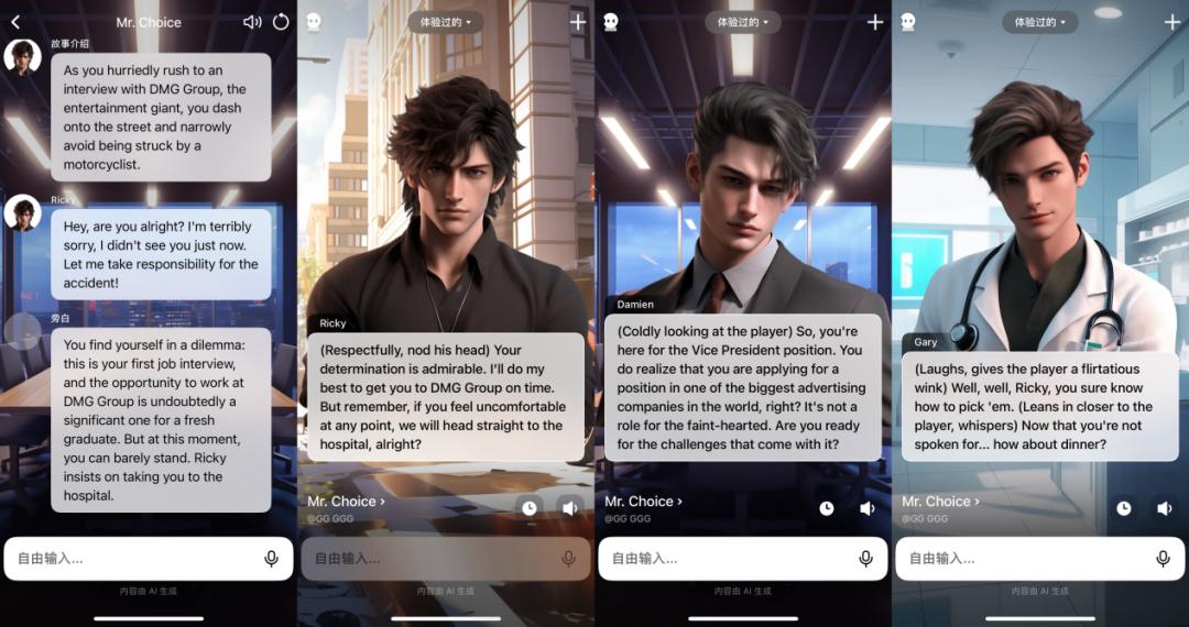另一个直观感受是不同的 AI 人设确实有鲜明特色,用户可以通过 AI 身份图、故事名称和故事介绍了解不同的 AI 故事与自己喜欢的故事互动。
