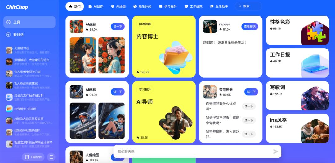 ChitChop 将所有 Bot 分成 AI 创作、AI 绘图、娱乐休闲、学习提升、工作提效、生活助手等 6 个大类,在大类下又会细分多个小类,用户可以按照热度和需求找到合适的 Bot。