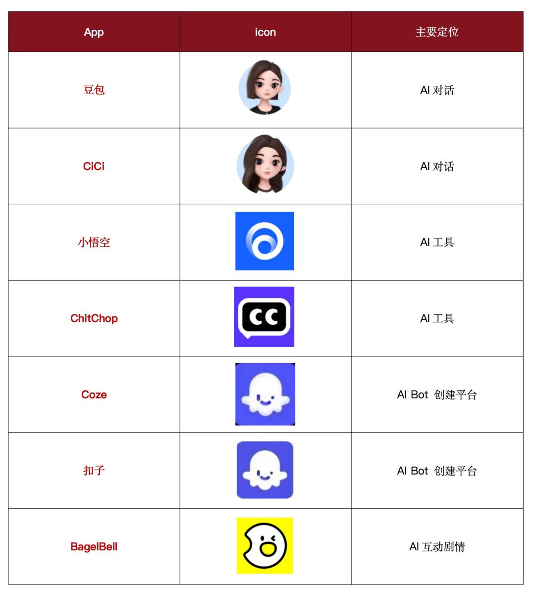 在过去一年,字节跳动旗下多个团队接连推出了 7 款基于 AI 的产品,分布对话、工具、互动剧情等多个类别,字节跳动在 AI 应用赛道再次采多方向试错的策略,积极训练大模型、测试自家模型能力、寻找 AI 应用场景,一次投掷多个靶面。