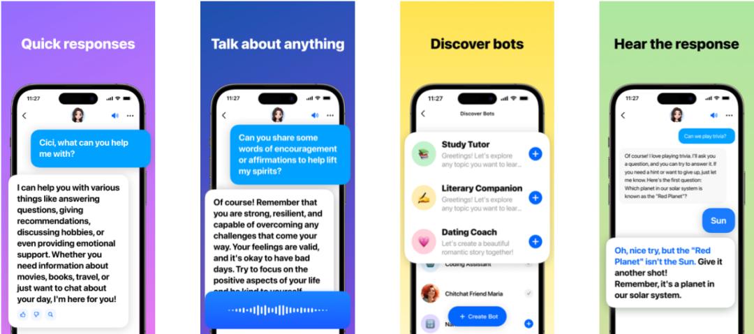 另外,实际上几款产品基本上都可以轻松找到对标品,豆包和 Cici 基本上对标文心一言和 ChatGPT,小悟空和 ChitChop 基本上对标 Poe 等提效平台,Coze 和扣子则对标 GPTs,BagelBell 则与 Talkie 相似。