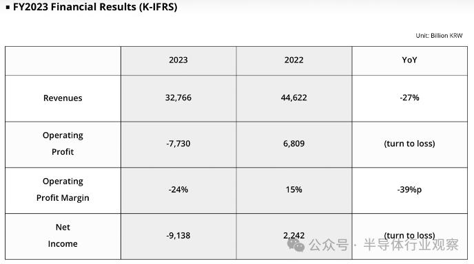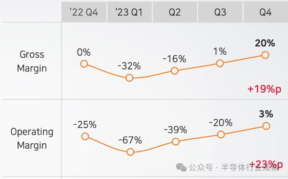 但其2023全年仍在亏损中,SK海力士2023年实现营收32.766万亿韩元,经营亏损7.73万亿韩元,经营利润率-24%。